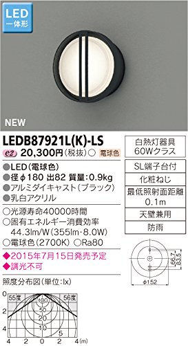 - 特記事項 : 調光不可・機能、特徴 : LED一体形・機能、特徴 (ピクトその他) : 白熱灯器具 60Wクラス、最低照射面距離0.1m、天井、壁面兼用、防雨
