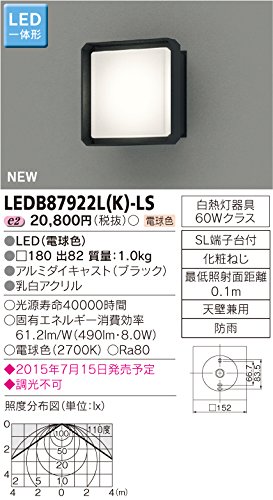 - 特記事項 : 調光不可・機能、特徴 : LED一体形・機能、特徴 (ピクトその他) : 白熱灯器具 60Wクラス、最低照射面距離0.1m、天井、壁面兼用、防雨