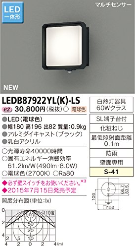 - 機能、特徴 : LED一体形、マルチセンサー、S-41、白熱灯器具 60Wクラス、最低照射面距離0.1m、防雨、壁面専用