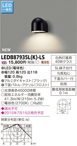 - 特記事項 : 調光不可・機能、特徴 : LED一体形、白熱灯器具 40Wクラス、下面カバー付、防雨、最低照射面距離0.1m、壁面専用