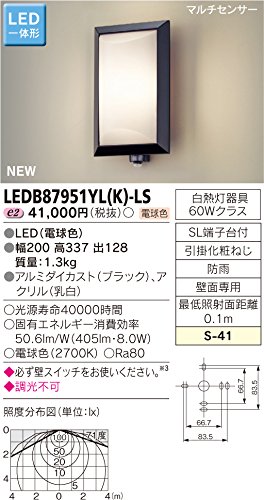 - 特記事項 : 調光不可・機能、特徴 : LED一体形、マルチセンサー・機能、特徴 (ピクトその他) : S-41、白熱灯器具 60Wクラス、最低照射面距離0.1m、防雨、壁面専用、最低照射面距離0.1m・消費電力最大値 : 8W