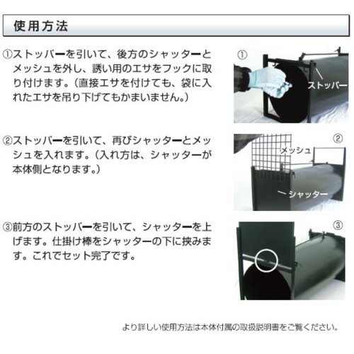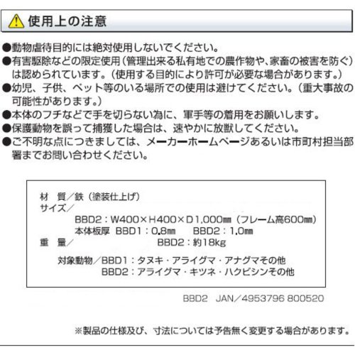 ●ドラム型で強度があり、動物の歯や爪を傷つけることなく捕獲・保管可能です。●処理をする人にも危害が及びにくく安全です。●本体の中は光が差し込みにくい為、動物が暴れにくい構造になっています。●製品サイズ/縦:1000mm横:400mm高さ:600mm●製品重量:18000g●パッケージサイズ/縦:1000mm横:400mm高さ:600mm●パッケージ重量:18000g●生産国:日本●材質:本体:鉄(塗装仕上げ)●本体板厚:1.0mm●対象動物:ハクビシン・アライグマ・キツネその他●製品サイズ:1000×400×600mm●重量:18000g●注意:お取り扱いには十分注意し、必ず軍手等の着用をお願いします。動物虐待目的には、絶対使用しないでください。●こちらの商品はメーカー受注生産品に付き、商品の発送までに約2週間ほどお時間が掛かります。納期は、ご注文後、追って御連絡させて頂きます。