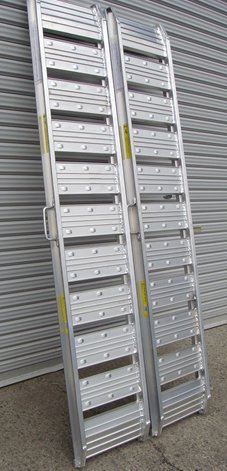 ★総重量の確認 本体重量およびその他付属品、オペレーターの体重を含めた総重量が最大積載荷重の範囲内で、かつある程度余裕があれば安心です。お薦めコメントはあくまで参考程度にお考えください。 ★最大積載荷重の表示について セット商品の場合は2本使用での最大積載荷重になります。 1本でご使用になる場合は表示の半分の最大積載荷重になりますのでご注意ください。 ★長さ選定の目安 設置角度が約15~20°になるような長さのアルミブリッジが推奨です。目安としてトラックの荷台高さの約3~3.5倍の長さが基準になります。※こちらの商品は長尺物となりますので運送会社の車輛の都合上、都内へのお届けのみ運送会社の営業所止めとなります。