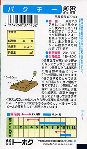 東南アジアをはじめ世界中で広く使われるセリ科の野菜です。 エスニック料理はもとよりお菓子やカレーの材料に、また茎葉はもちろん根やタネも利用されています。 学名、科名: Coriandrum sativum セリ科コエンドロ属 英名: Coriander 種類: 耐寒性1年草 別名: シラントロ 和名: コエンドロ、カメムシソウ 味わい方: スープ、サラダなど 播種時期: 春まき:3月下旬~5月下旬 秋まき:9月上旬~10月下旬 収穫時期: 春まき:6月上旬~10月下旬 秋まき:10月上旬~11月下旬 発芽適温: 約20~30℃前後 発芽日数: 播種深さ: 採種国: イタリア 容量: 65ml 発芽率: 約60%以上 おおよその目安です。発芽率を保証するものでは有りません。 撒き方: 発芽温度が高いので暖かくなってからポットにまきます。 発芽したら本葉5枚の頃目的の場所に15~20cm間隔に植えかえます。 直播きすることもできます。 育て方: 日当たりの良い場所で育てて下さい。 肥料は1平方メートル当たり苦土石灰100g、少量の化成肥料、腐葉土1kgを施してよく耕しておきます。 草丈が20cm位になったら若い茎葉を順次利用します。 スープやサラダにはもちろんのこと、ベルギーではビールの原料としても利用されています。