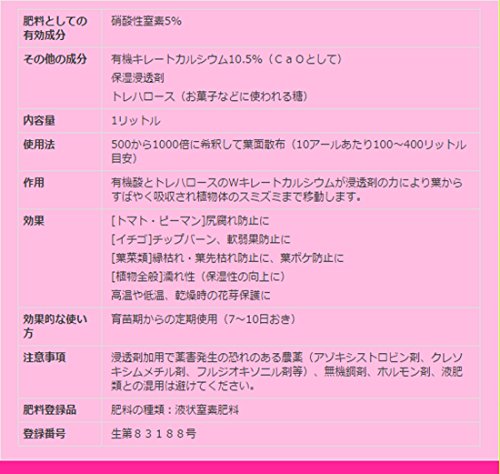 - その他の成分:有機キレートカルシウム10.5%(CaOとして)、保湿浸透剤、トレハロース(お菓子などに使われる糖)