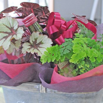 観葉植物をミックスバスケットにアレンジしてお届けします。組み合わせは、当社デザイナーにおまかせください。ミニボトルワインもご一緒に♪父の日、成人式のお祝いに、お誕生日、記念日に、お花を見ながら、乾杯♪素敵ですね。