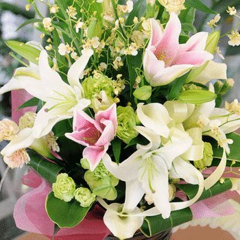 お誕生日・記念日・結婚の祝い・お見舞い…etc幅広いご用途に最適です。ピンク&白ユリメインの爽やかで豪華なアレンジメント。花材は入荷状況により多少変わりますが、イメージのようにお作り致します。