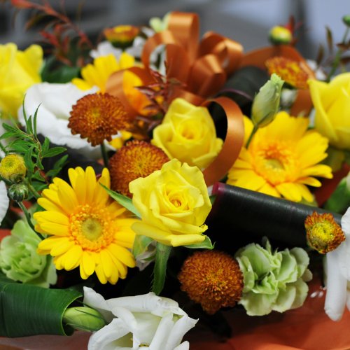- 季節の花を使った黄色、オレンジ系のアレンジメント