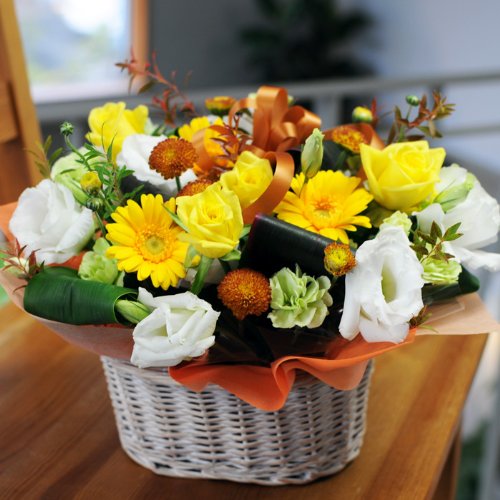 黄色オレンジ系の上品なアレンジメント。 元気が出て明るくなるアレンジメントです。お見舞い、お誕生日等大変喜ばれている商品です。