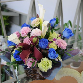 - ※白系の薔薇を特殊なブルーの液体を茎から吸わせて作っています。花材、ブルーローズの本数は入荷状況により異なります。