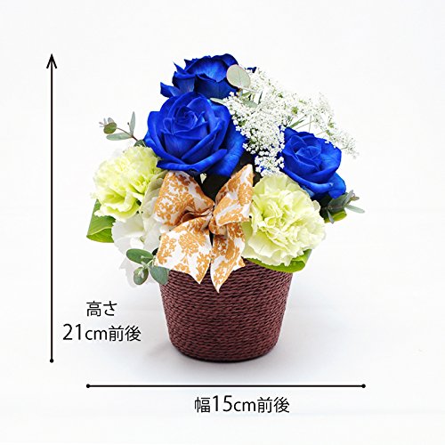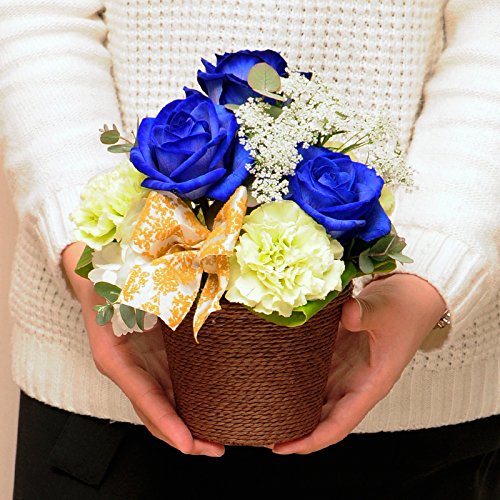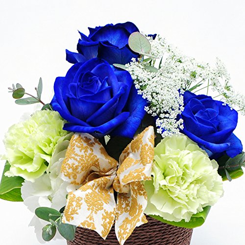 【ミラクルブルーについて】神秘的な青いバラ(ブルーローズ)を使ったアレンジメントになります。サイズもコンパクトに、お手頃価格でご用意しました。青いバラ(ブルーローズ)をメインに、カーネーションやあじさいを使用して作成しております。ブルーローズは大変珍しいため、サプライズとしてもお喜び頂けます。 【商品のサイズについて】幅15cm×奥行15cm×高さ21cm 【配送について】配送業者に委託してのお届けとなります。交通事情や悪天候等の理由により、商品の配達に遅れが生じる場合がございます。予めご了承下さいますようお願い致します。 ※山間部等、時間指定が出来ない地域もございます。 ※お花の入荷状況によっては、お客様のご希望のお日にちにお届け出来ない場合もございます。 ※沖縄、その他離島へのお届けは出来ません。