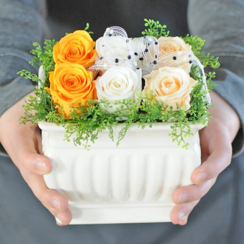 生のお花を、美しい姿で長時間保存することができるよう専用の溶液を用いて加工されておりますので、香りはありませんが、みずみずしい生花の風合いが保てます。加工してありますので、花粉が飛ぶこともなく、水を与える必要がありません。しかし、湿気に弱く、紫外線は色褪せの原因にもなりますので、直射日光を避けて飾って下さい☆