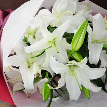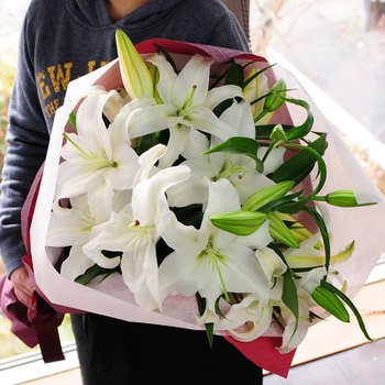 大輪カサブランカ(ユリ)を豪華に花束にしてみました。・配達中の傷付きを防ぐ為、蕾の状態で花束を作成します。※画像は開花時のイメージです。