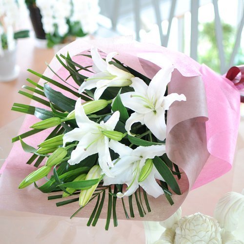 誕生日、記念日、お供え、命日等に大変人気のある商品です。オリエンタル系の白いゆりを豪華に花束にしました。お花は最低でお選びいただいた数以上です。(開花と蕾の合計です。)父の日のギフトにも最適です。長持ちするよう、基本的に蕾が多めでのお届けとなります。 また、入荷のタイミングによりことなります。
