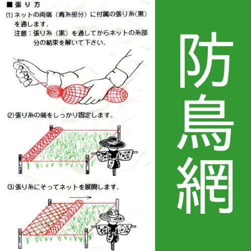 田や畑のトリよけネット。網目の大きさ:45mm×45mm●張り糸付き 田や畑に 鳥よけ・スズメよけPE防鳥網 3.6m×9.0m 約10坪 A?10PE防鳥網 3.6m×18m 約20坪 A?20PE防鳥網 7.2m×9.0m 約20坪 A?20PE防鳥網 5.4m×18m 約30坪 A?30PE防鳥網 9.0m×10.8m 約30坪 A?30 PE防鳥網 9.0m×18m 約50坪 A?50PE防鳥網 18m×18m 約100坪 A?100PE防鳥網 18m×27m 約150坪 A?150PE防鳥網 18m×36m 約200坪 A?200PE防鳥網 18m×54m 約300坪 A?300