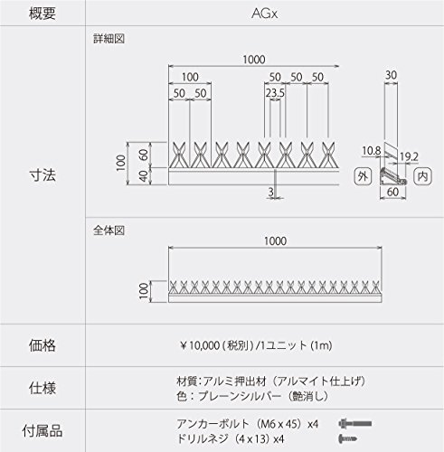 ●シンプルかつコンパクトなデザインながら高い防犯性を誇る忍び返しです●スペック:W1000mm×H100mm×D60mm●原産国:日本●材質:アルミ押出材