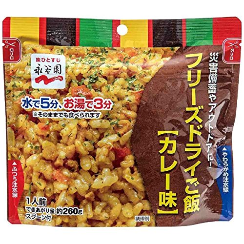 お湯で3分、水でも5分で召し上がれます。【メディアで紹介されました!!】・2017年8月24日【WEB】講談社Hot-DogPRESS NTTdocomo「dマガジン」☆この他にも話題のアイテムが盛りだくさん!☆メディア掲載商品一覧はこちら↓↓ https://hands.net/special/list/l0020414【特長】・食べたい時にすぐできるフリーズドライのご飯です。・お湯で3分、水でも5分で召し上がれます。・水無しでそのままスナックのようにも召し上がれますし、お湯の量を増やして、おかゆのように召し上がることもできます。【原材料】ごはん(うるち米(国産)、植物油脂)、カレールゥ(乳成分/小麦/大豆を含む)、トマトペースト、乾燥人参、カレー粉、炒め玉ねぎ、食塩、砂糖、ポークエキス、ビーフエキス、パセリ、にんにく/調味料(アミノ酸等)、トレハロース、カラメル色素、酸化防止剤(ビタミンE)、調味料 【調理方法】(1)袋から脱酸素剤とスプーンを取り出してください。(2)袋を手前に傾けてご飯を手前に寄せ、内側の黒い線が見えるように袋の口をよく広げて平らなところに置いてください。(3)袋の口をよく広げ、お湯または水をゆっくり注いでください。ご飯が水分を吸収して黒い線が見えなくなったら、スプーンでよくかき混ぜてご飯を平らにしてください。(4)黒い線にあうように、さらにお湯または水をゆっくり注ぎチャックを閉めてお湯で3分、水でも5分でできあがります。※注水量:上の線でやわらかめ(約255ml)、下の線でふつう(約175ml) ・脱酸素剤が入っています。食べられませんので取り除いてください。・電子レンジでの調理不可