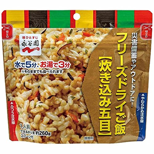 お湯で3分、水でも5分で召し上がれます。【特長】・食べたい時にすぐできるフリーズドライのご飯です。・お湯で3分、水でも5分で召し上がれます。・水無しでそのままスナックのようにも召し上がれますし、お湯の量を増やして、おかゆのように召し上がることもできます。【原材料】ごはん(うるち米(国産)、植物油脂)、醤油(小麦・大豆を含む)、ごぼう、乾燥人参、食塩、昆布エキス、チキンエキス、乾燥ねぎ、生姜、椎茸、ひじき、砂糖、鰹節エキス/調味料(アミノ酸等)、トレハロース、カラメル色素、酸化防止剤(ビタミンE) 【調理方法】(1)袋から脱酸素剤とスプーンを取り出してください。(2)袋を手前に傾けてご飯を手前に寄せ、内側の黒い線が見えるように袋の口をよく広げて平らなところに置いてください。(3)袋の口をよく広げ、お湯または水をゆっくり注いでください。ご飯が水分を吸収して黒い線が見えなくなったら、スプーンでよくかき混ぜてご飯を平らにしてください。(4)黒い線にあうように、さらにお湯または水をゆっくり注ぎチャックを閉めてお湯で3分、水でも5分でできあがります。※注水量:上の線でやわらかめ(約255ml)、下の線でふつう(約175ml) ・脱酸素剤が入っています。食べられませんので取り除いてください。・電子レンジでの調理不可。