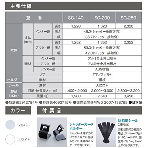 ●「シャッターを守って、大切な財産を守る」をコンセプトに設計されたシャッター補強用のガードです。テレビでも紹介をされています。大きな特徴としては、軽くて、女性でも簡単に設置できる操作性や機能性、効果、強度を配慮した製品設計といった基本要素だけでなく、シンプルですっきりしたデザインもポイントです。国産の軽量シャッター向けに使用可能です。(アルミ製シャッター、電動シャッター・一部防風軽量型シャッターには使用不可)設置可能寸法はシャッター1枚の横幅1.4~3.2mまでのものとなります。特に手動式で複数枚をガイドレール(中柱)でつなげているタイプに有効です。リサイクル性を考慮したアルミ合金素材を使用し、ecoにも注力しています。付属の「防犯用シール」を用いることで庫内からの盗難を防止することも可能。特許第3912794号・特許第4092715号を取得し、国際公開番号 WO 2007/138788を取得している、品質にも自信のある日本製のシャッターガードです。