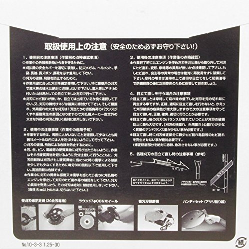 ●【用途】刈払機用チップソー。●【機能・特徴】下刈り、草刈り、笹刈作業にに効果を発揮します。刃が磨耗すればヤスリなどで研磨すれば簡単に切れ味が復活します。穴付で軽量です。【注意事項】刈払機の安全カバーを適切に装着し、防災メガネ、ヘルメット、手袋、長袖、長ズボン、長靴を必ず着用して下さい。作業をする時は、周囲に人がいない事を確認して少なくとも周囲15メートル以内には人を近付けないようにして行なって下さい。