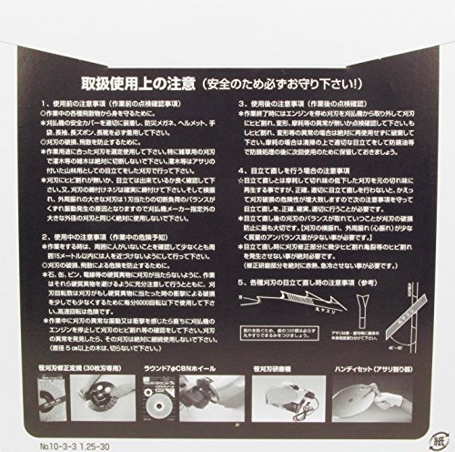 ●【用途】刈払機用チップソー。●【機能・特徴】下刈り、草刈り、笹刈作業にに効果を発揮します。刃が磨耗すればヤスリなどで研磨すれば簡単に切れ味が復活します。【注意事項】刈払機の安全カバーを適切に装着し、防災メガネ、ヘルメット、手袋、長袖、長ズボン、長靴を必ず着用して下さい。作業をする時は、周囲に人がいない事を確認して少なくとも周囲15メートル以内には人を近付けないようにして行なって下さい。