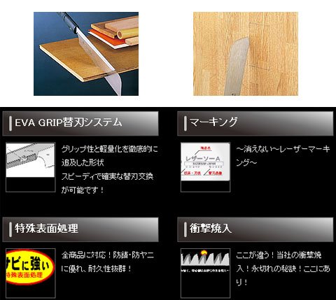 03シリーズ名人芸が実現した鋭い超薄刃。まさに逸品、絶妙の切れ味。【特徴】●レザーソーA型をベースに刃先がアゼ挽き兼用になっています。●切れ味・切り口の美しさは勿論のこと、コンセント穴や換気扇穴などの平面窓加工に最適です。●古くから親しまれている「藤巻きタイプ」と滑り止め効果を発揮する「EVAGRIPタイプ」があります。【用途】●一般木材・化粧合板・塩ビ・デコラ・アゼ挽兼用【仕様】●刃長:240mm●板厚:0.3mm●ピッチ:1.5(寸20枚目)