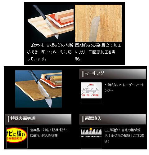 180シリーズ使いやすさを考慮した短い刃長180mmで、狭い場所での作業や穴あけ加工にも最適。用途が広く小回りの利く便利鋸。【特徴】●さまざまな材料に対応できるシャープな切れ味と、背金が短いため厚い材料の切り落としがラクラク。●先端に施したR目立で細工性に優れており、一般細工からコンセントや換気扇の穴加工まで、広い用途に対応した細工鋸です。【用途】●一般木材・合板・集成材・塩ビ・デコラ【仕様】●刃長:180mm●板厚:0.5mm●ピッチ:1.5(寸20枚目)