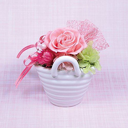 ◆上品な白の陶器にお花を合わせてエレガントに仕上げました。小ぶりなサイズが派手すぎず、さりげなく置けるブリザーブドフラワー バスケット です。