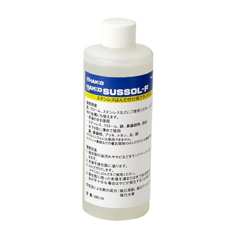 【用途】ステンレス用フラックス。【機能・特徴】ハロゲン化亜鉛と数種の特殊有機物および界面活性剤から合成された、ステンレス用フラックスです。有毒ガスの発生がリン酸化合物に比べて極端に少なく、しかも耐熱性があるので、はんだ付け特性が低下せずクロームのはんだ付けも可能です。【材質】●成分:塩化亜鉛35~45%・塩化アンモニウム10%。●塩化水素5%・界面活性剤5%・精製水45~55%。【注意事項】ステンレス・金属の表面にある不動体皮膜を取り除くため、この製品には強い酸を使っています。酸は電気・電子部品に使うと腐食を起こすため、絶対に使用しないでください。アルミニウムには使用できません。