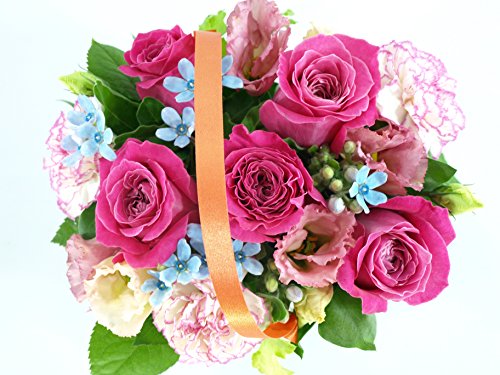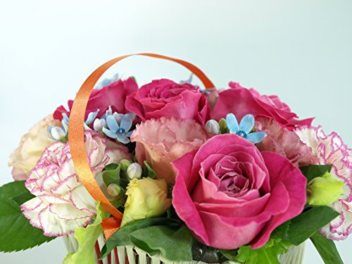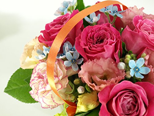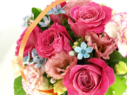 - サイズ:高さ約20センチ、横約25センチ、奥行き約20センチ、使用花材:5本のピンクバラと季節や仕入れ状況によって品種など変わります。