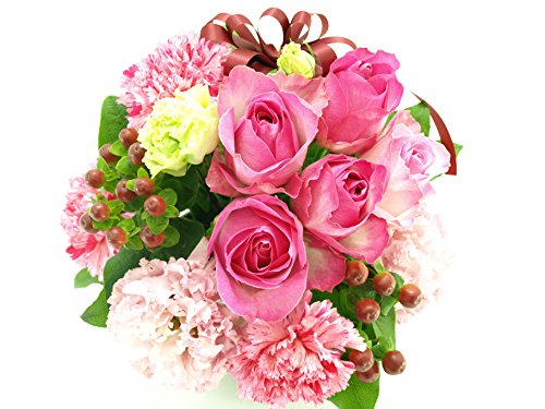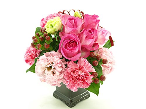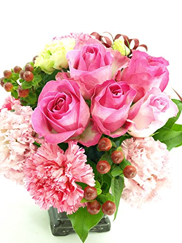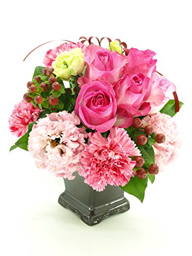 - サイズ:高さ約25センチ、横約25センチ、奥行き約25センチ、使用花材:ピンクのバラと季節や仕入れ状況によって変わります。