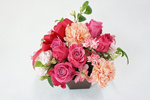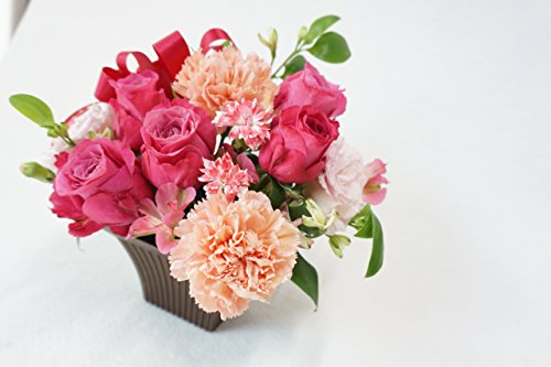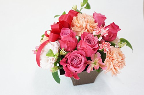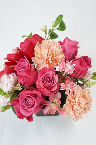 - サイズ:高さ約20センチ、横約20センチ、奥行き約20センチ、使用花材:ピンクバラとカーネーションなど季節や仕入れ状況によって変わります。
