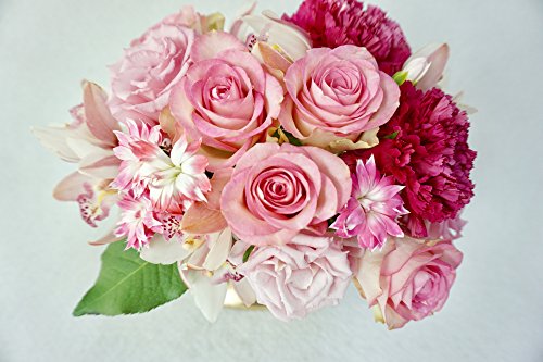 - 四方見:サイズ:高さ20センチ、横約20センチ、奥行き約20センチ、使用花材:カーネーションとトルコキキョウなど季節や仕入れ状況によって変わります。
