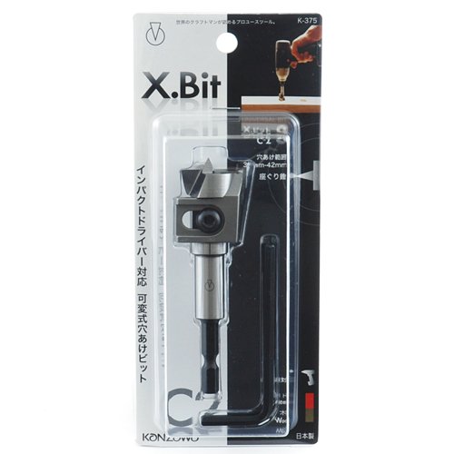 ●14.4Vインパクトドライバー対応商品です。●【用途】●木工・ボード用先端工具。●【機能・特徴】●可変式穴あけ工具です。●座ぐり、貫通穴に最適です。●穴あけサイズが付属の六角レンチ1本で調整できます。●【仕様】●穴あけ径:30mm~42mm。●穴あけ深さ60mm。●使用機種:インパクトドライバー・電気ドリル・充電ドリル・ボール盤。●【商品サイズ】重量95g●商品コード:4976226375016●JANコード:4976226375016●ブランド名:神沢●商品名:X.ビットS●規格:K-375 C-2