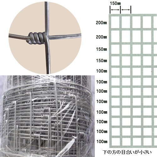 猪、鹿、アライグマ、ハクビシン、クマの 侵入防止に! フレキシブルかつ強力な継ぎ目構造です。 丈夫でサビに強い亜鉛メッキ線です。 網目は、下にいくほど目合いが小さくなっています。 ◆商品仕様◆ 網目巾:約15cm 線径:約2.5mm 重量:約20.8kg サイズ:約高さ1.5m×長さ30m 材質:亜鉛メッキ