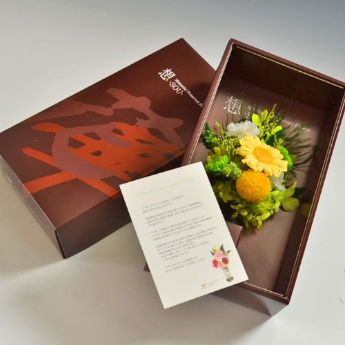 大切な人へお供えするお花… いつも美しくきれいなお花をお供えしたい。 そんなお客様のお声からうまれた仏花。 「メモリアル プリザーブドフラワー”想”」 形式にとらわれすぎない新しいカタチの仏花です。 モダン仏壇などの家具調仏壇にはもちろん、従来の仏壇にも美しいままで彩りを与えます。 お好きな花を美しいままにお届けできますので、贈答用としてもおススメいたします。 ※「円華」は造花を使用しておりません。 《プリザーブドフラワーをおススメする理由》 1.生花のような質感で長く飾れます 2.お水は必要ありません 3.四季に左右されずお好きなお花を飾れます 4.生花に比べ家計にやさしい! 5.衛生的で人と環境にやさしい お箱を開けるとフィルム越しにお花を確認していただくことができます。 また「プリザーブドフラワー取扱説明書」も入っていますので 初めての方でも安心してご使用いただけます。