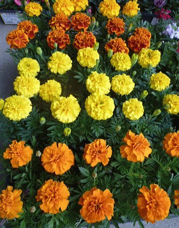 マリゴールド【Marigolds】 キク科 タゲテス属 1年草 【花期】6月~9月(地域により異なりますが酷暑は開花が止まります) マリゴールドはアフリカ系とフレンチ系に大きく分けられます。アフリカン・マリゴールドは草丈が長く大型種で花壇植えで映え、切り花として多く利用されています。フレンチ・マリゴールドは成長しても草丈は50cmまでと短く花も小輪ですが、丈夫で開花期間が長く初夏~秋まで咲き続けます。まとめ売りで販売しているのはこのフレンチ・マリゴールドです。細い尖った葉全体には脂腺があり独特の強い臭気をもち、防虫効果もあるといわれます。マリゴールドを花壇に混植すると土壌中の線虫(ネマトーダ)の駆除に効果があるといわれています。 【管理】マリゴールドは育てやすい草花として初夏~秋まで花壇を彩ります。あまり肥沃な土地では葉ばかりが茂って花がなかなか咲きませんのでとくに肥料を必要としません。厳しい暑さが何日も続くと花が止まることもあります。夏は蒸れに注意し乾燥気味に管理しましょう。