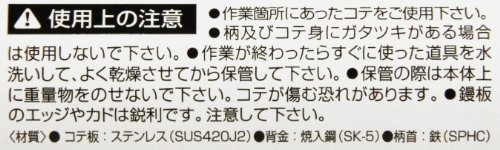 【用途】壁の仕上塗り用。【機能・特徴】仕上塗りに最適です。ステンレス製で手入れ簡単です。【注意事項】作業箇所にあったコテを使用ください。柄及びコテ身にガタツキがある場合は使用しないでください。作業が終わったらすぐに使った道具を水洗いして下さい。保管の際は本体上に重量物を乗せないで下さい。コテが傷む恐れがあります。