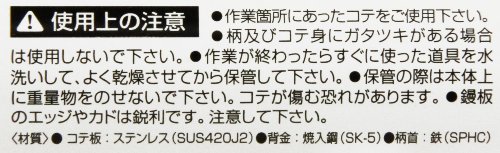 【用途】壁の仕上塗り用。【機能・特徴】仕上塗りに最適です。ステンレス製で手入れ簡単です。【注意事項】作業箇所にあったコテを使用ください。柄及びコテ身にガタツキがある場合は使用しないでください。作業が終わったらすぐに使った道具を水洗いして下さい。保管の際は本体上に重量物を乗せないで下さい。コテが傷む恐れがあります。