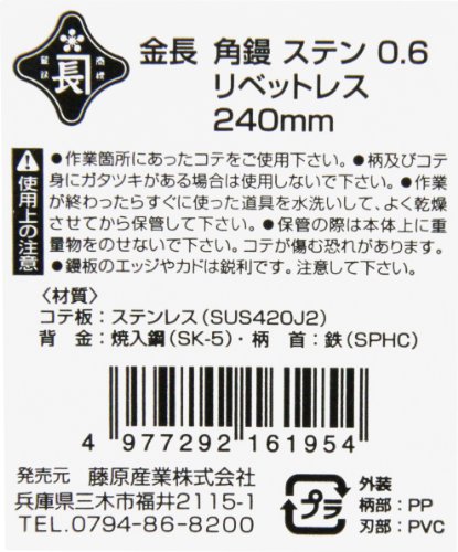 金長 ステンレス製 角鏝 板厚0.6mm リベットレス 240mm