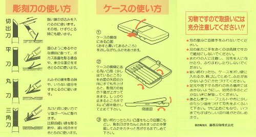 ●すべらないから安全な、ノンスリップシート付。●図工・美術教材用・趣味の版画・彫刻用に使いやすく切れ味が良い。●パッケージサイズ/縦:190mm横:110mm高さ:25mm●パッケージ重量:194g●プラケース入り5本組●刃:付鋼製刃●ケースサイズ:全長185×幅97mm 彫刻刀サイズ:全長160mm×幅15mm●セット内容:平刃・切り出し・三角刀・中丸刀・小丸刀・ノンスリップシート・名前シール●あとしまつ:油をつけて刃先をよくふいてください。サビ止めにもなり、いつまでもすばらしい切れ味がたのしめます。●注意:刃の前方に手をおくのは危険ですので絶対にしないでください。まわりの人に注意し、刃先を人に向けたり、ふりまわしたりしないで下さい。使い終わったら、ケースをポリ袋に入れるか、輪ゴムで止めてふたが開かないように片付けてください。