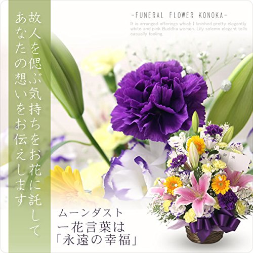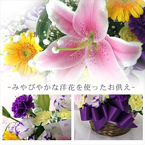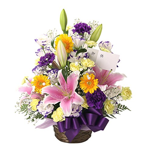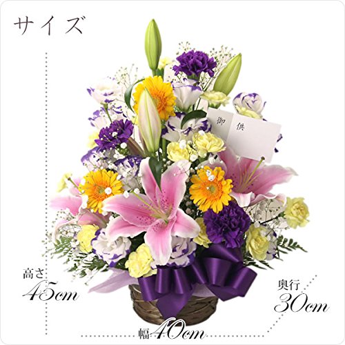 - 【商品内容】ムーンダスト、ユリ、ガーベラ、トルコキキョウ、スプレーカーネーシかすみ草、レザーファン、花カゴお花のお手入れカード、ギフトラッピング、お供えカード付き※こちらの商品は、入荷の状況によって、色、種類が異なる場合があります。【サイズ】横幅約40cm×奥行約30cm×高さ約45cm