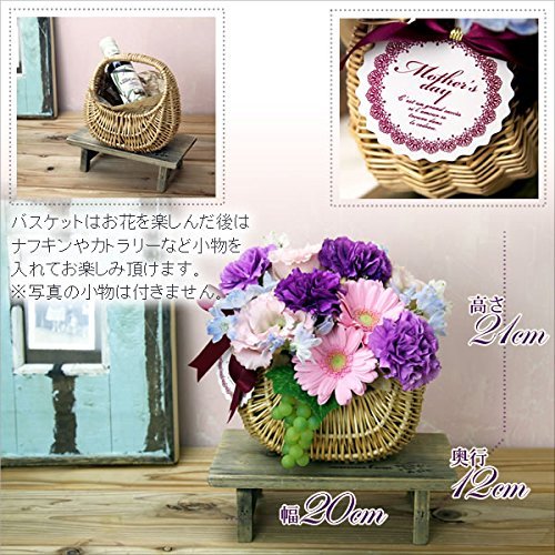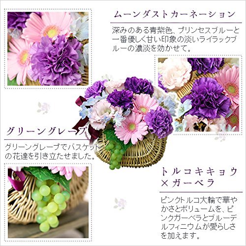 - 【商品内容】ムーンダスト(プリンセスブルー・ライラックブルー)、ガーベラ、トルコキキョウ、デルフィニウム、グリーングレープ(フェイク)、三日月バスケット、マザーズデーリボン、切花長持ち剤、お花のお手入れガイド、ギフトラッピング※こちらの商品は入荷の状況によって、色、種類が異なる場合があります。【サイズ】横幅約20cm×奥行約12cm×高さ約21cm