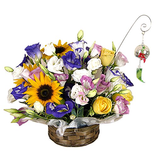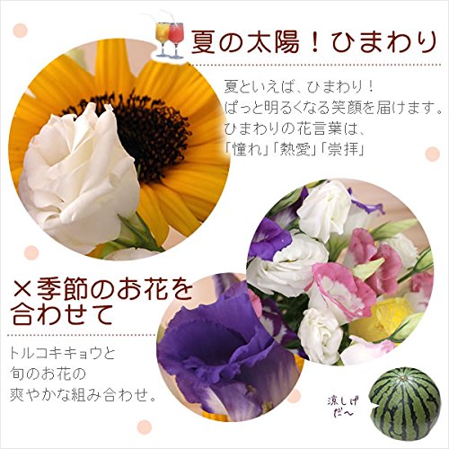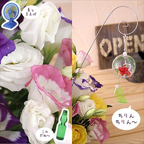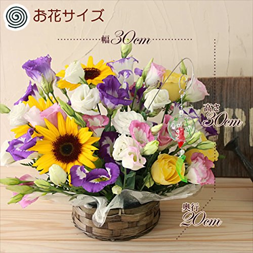 - 【商品内容】風鈴ピック1本(色はおまかせとなります)、トルコキキョウ、ひまわり、季節のお花 、レザーファン、バスケット、切花長持剤1袋、お花のお手入れガイド付、お花のお手入れカード、ギフトラッピング、メッセージカード付き ※こちらの商品は、入荷の状況によって、色、種類が異なる場合があります。ご了承くださいませ。