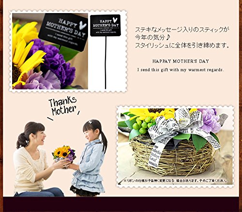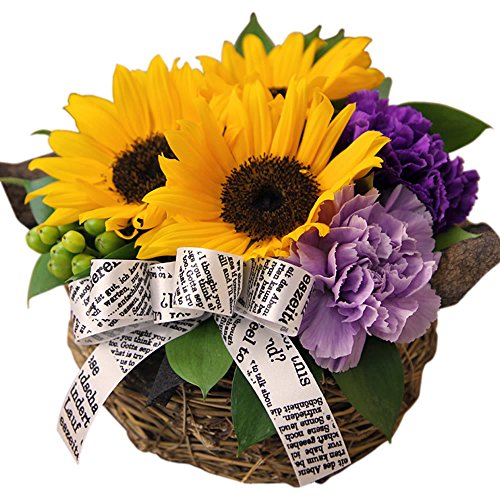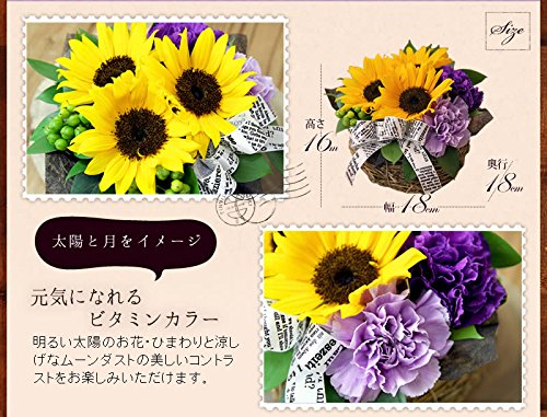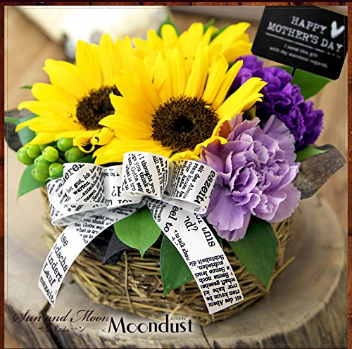 - 【商品内容】ムーンダスト(2色)、ひまわり、ヒペリカム、丸葉ルスカス、バスケット、ギフトラッピング、お花の長持ち剤付、母の日ピック付、お手入れガイド 【サイズ】横幅約18cm×奥行約18cm×高さ約16cm 翌日配達お花屋さんオリジナルギフトボックスにて出荷