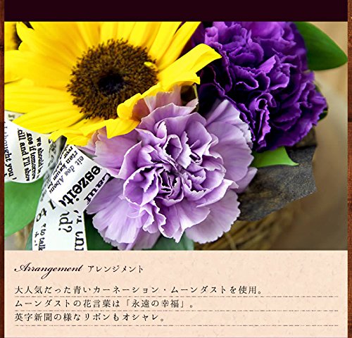 太陽と月をイメージした、ナチュラルなデザインのアレンジメントです。青いカーネーション・ムーンダストを使っています。ムーンダスト花言葉は「永遠の幸福」。 【商品内容】ムーンダスト(2色)、ひまわり、ヒペリカム、丸葉ルスカス、バスケット、ギフトラッピング、お花の長持ち剤付、母の日ピック付、お手入れガイド 翌日配達お花屋さんオリジナルギフトボックスにて出荷 お花についてのお問い合わせ、ご相談はお気軽にお電話ください!「翌日配達お花屋さん Amazon店 」0120-945-878 フリーダイヤル (月)~(土)10:00~17:00 定休日:日曜日