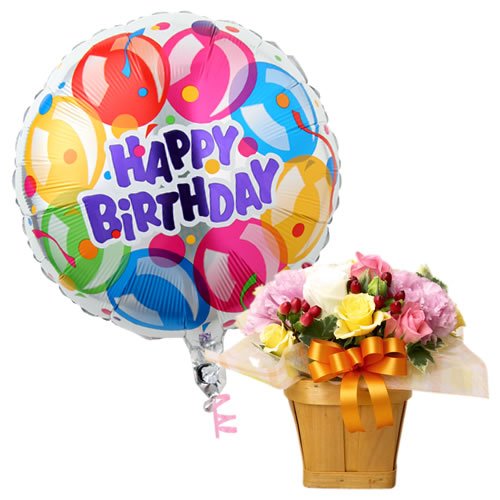 バルーンフラワー ガーデンパーティ 浮かぶバルーン(バースデー)と生花アレンジのセット 誕生日 記念日 開店祝い などに