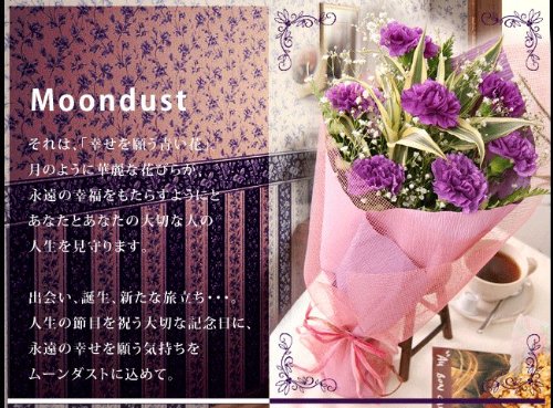 - 【商品内容】ムーンダスト(青いカーネーション)、季節の小花、グリーン・切花長持ち剤、取り扱い説明書付、お手入れガイド・ギフトラッピング付※こちらの商品は、入荷の状況によって、色、種類が異なる場合があります。ご了承くださいませ。