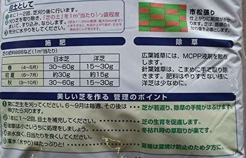 - 使い方として: 床土の場合: 土が固い場合には、軽石やバーク堆肥を混ぜて土壌を調整し、レーキ等で整地をします。その上に芝の土を1平米当たり1.5袋程度まいてから芝を張り、タタキ板等で落ち着かせ、更に芝の土を1平米当たり1/3袋程度まいてすり込み、ならして下さい。最後に充分に水やりをして、根付くまで水切れを起こさないように管理して下さい。 目土の場合: 年に1~2回芝刈り後に刈り芝を取り除き、芝の土を1平米当たり1/3袋程度まいてすり込み、ならして下さい。最後に充分に水やりをして、風で飛ばないよう落ち着かせます。