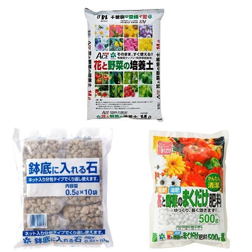 花と野菜の培養土14Lとネットに入った鉢底石と花や野菜に使える肥料の3点セットです。